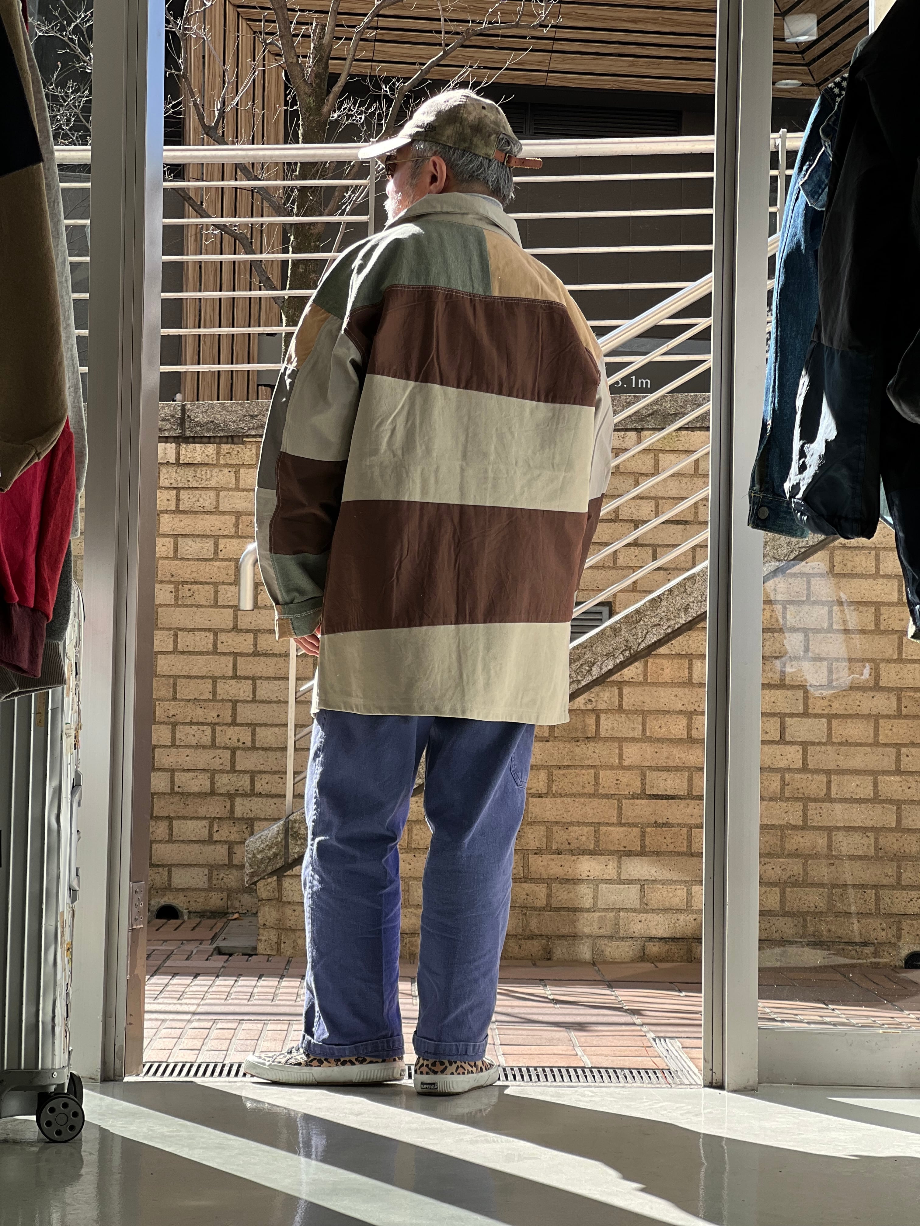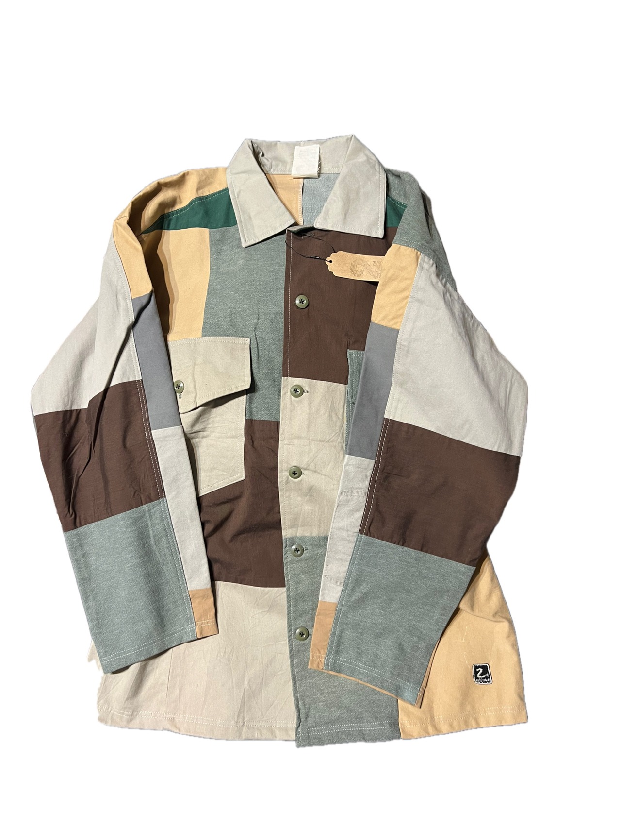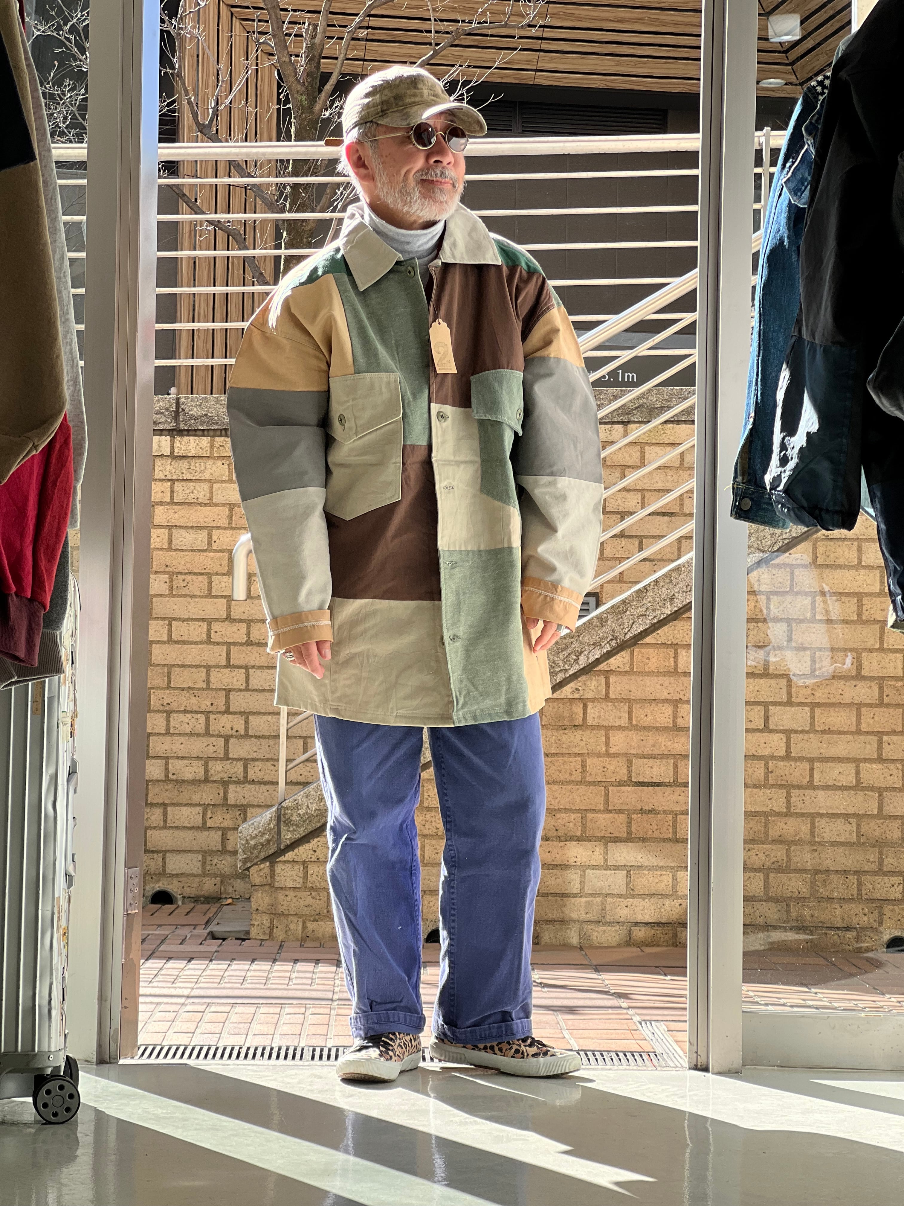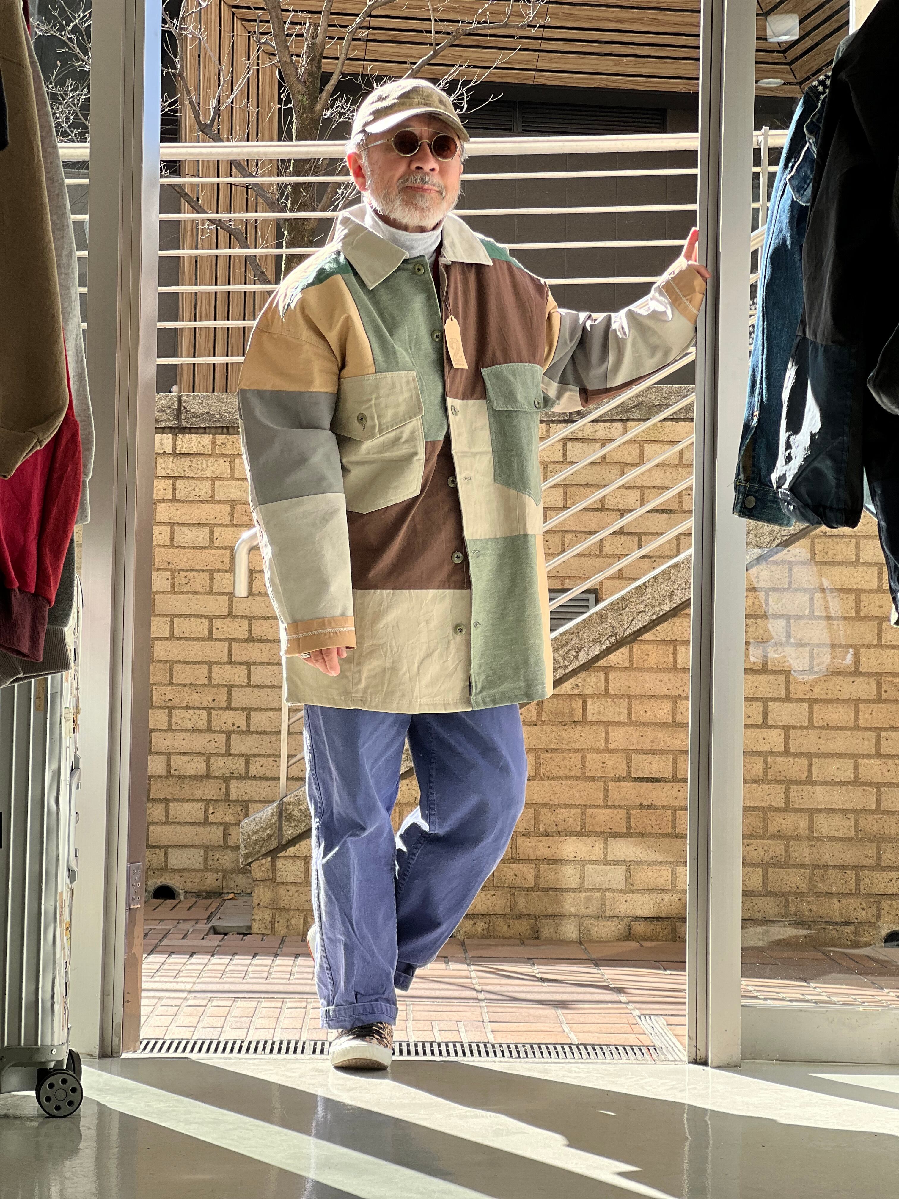 廃棄になるかものシャツやパンツ、生地を再構築してブロッキングのシャツアウターに生まれ変わらせました。唯一無二の商品になります。
