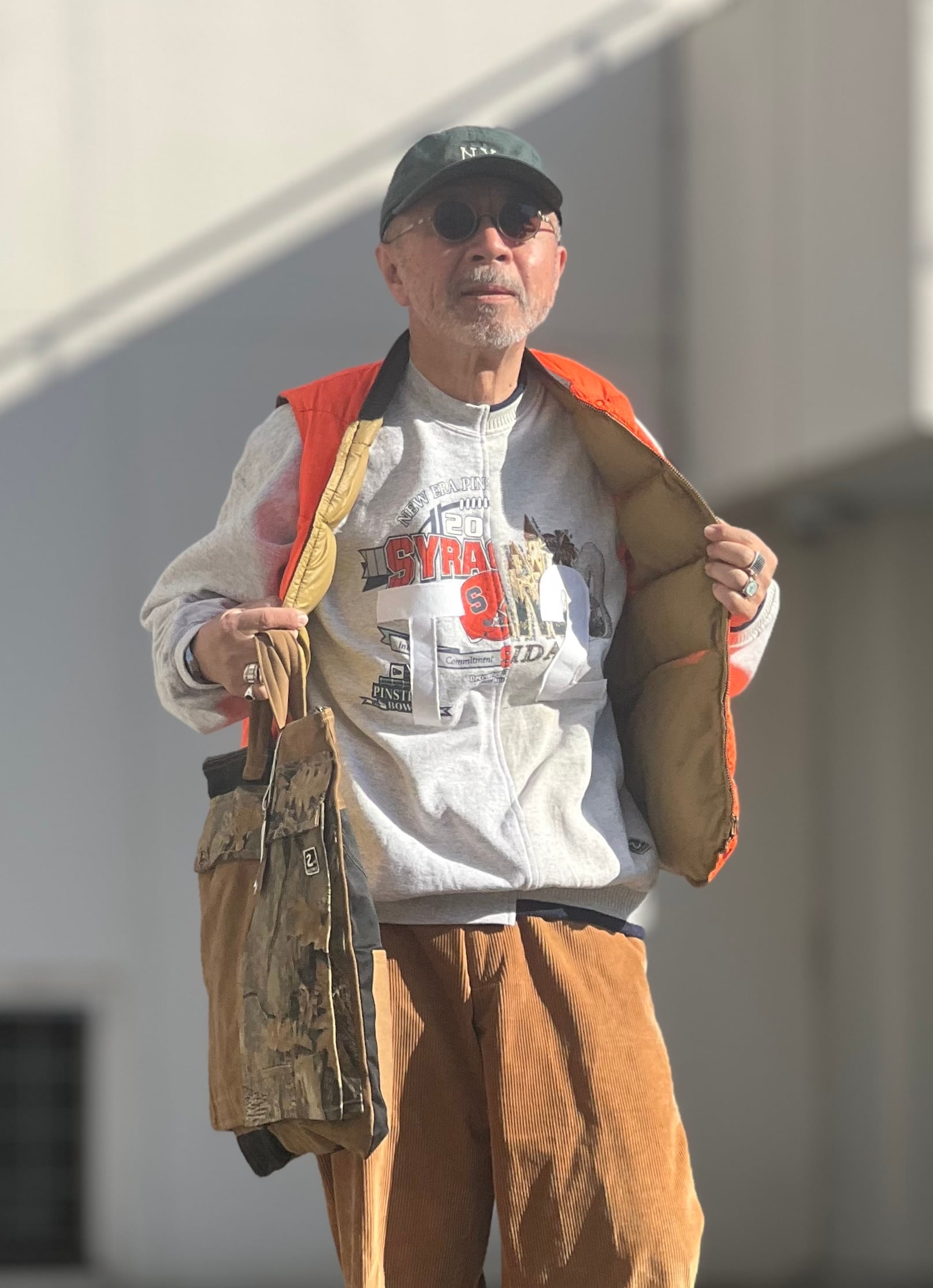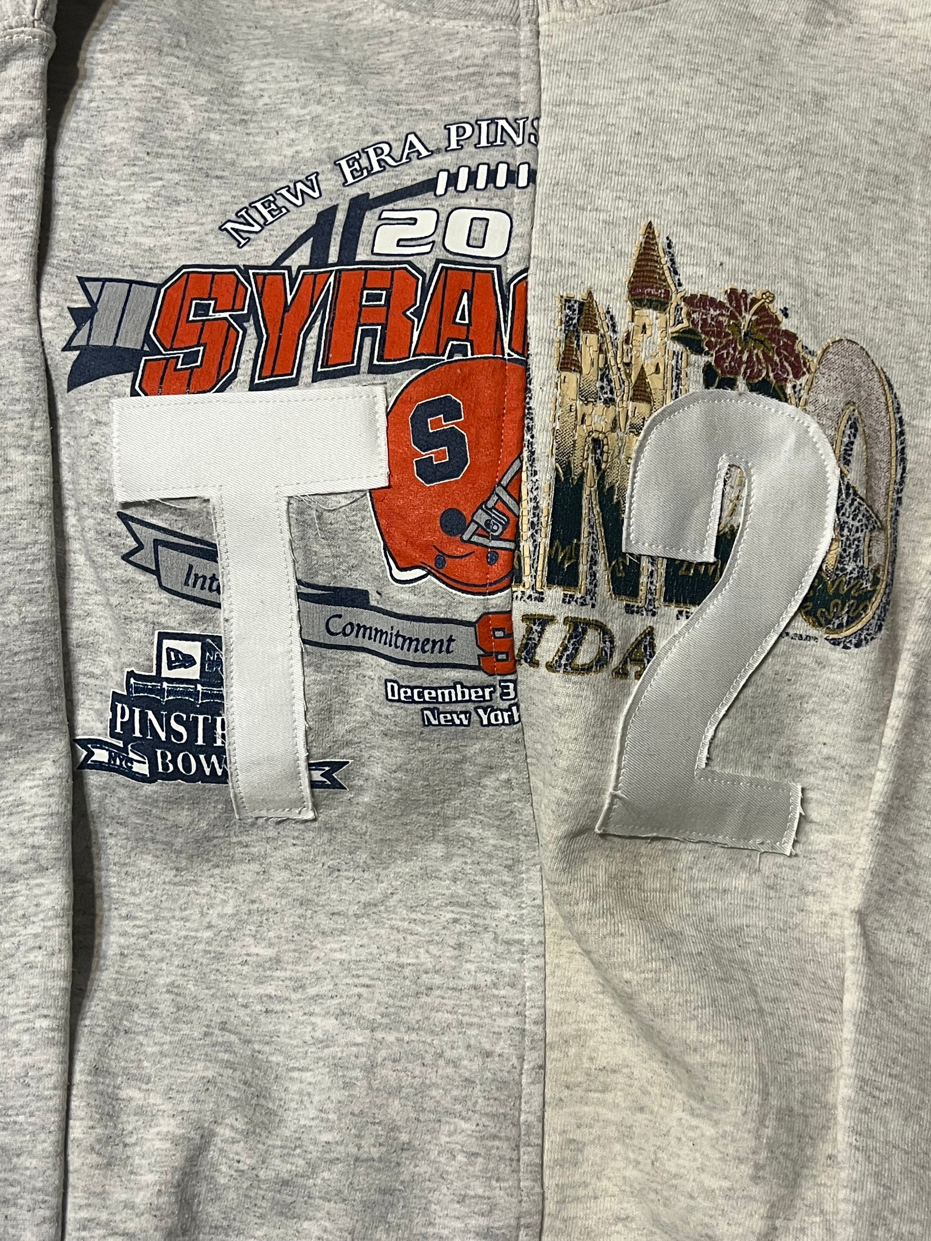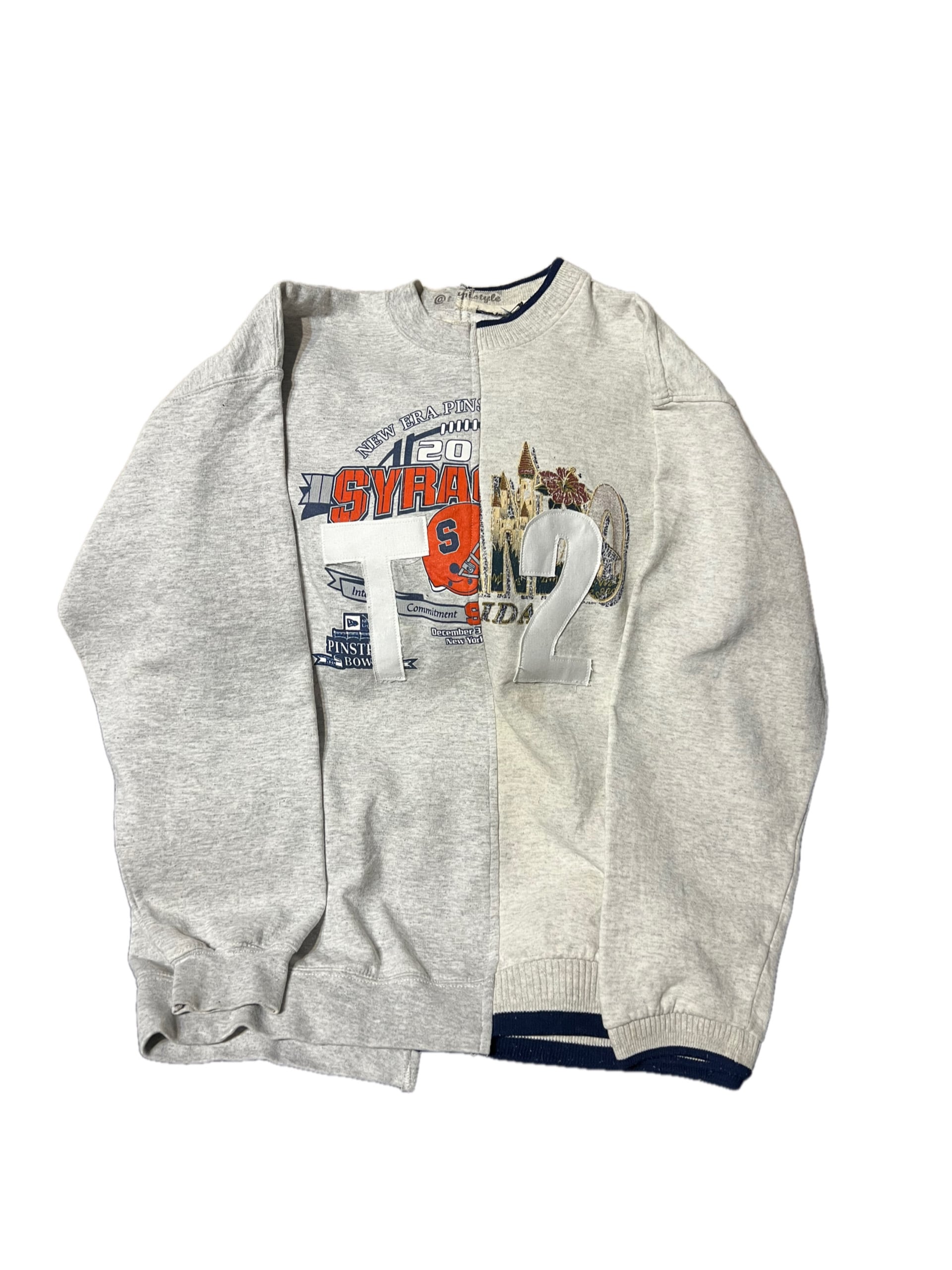 2つのスウェットをリメイクして1つのスウェットにしてるのでフロントのプリントがとても特徴的になっています。