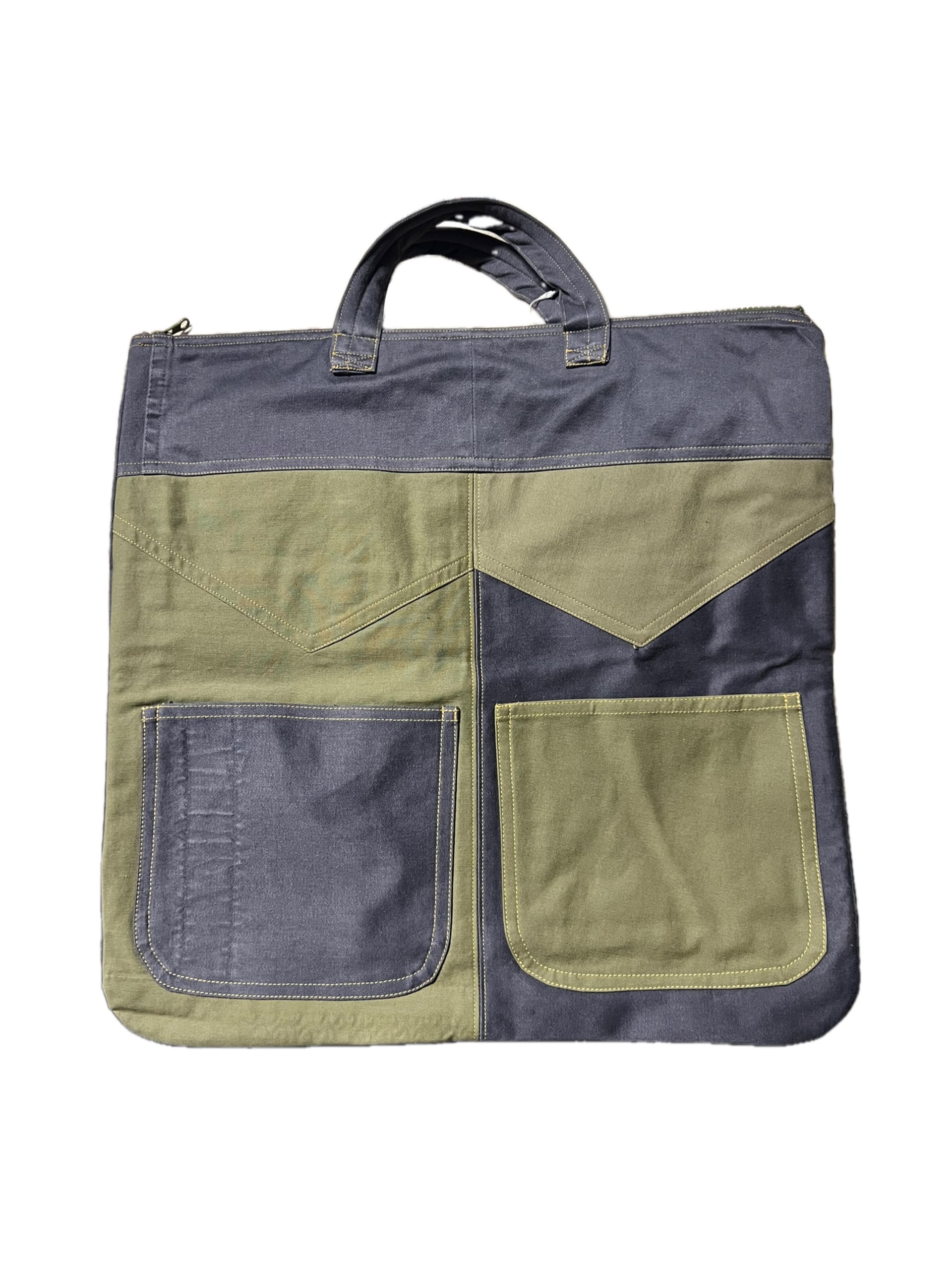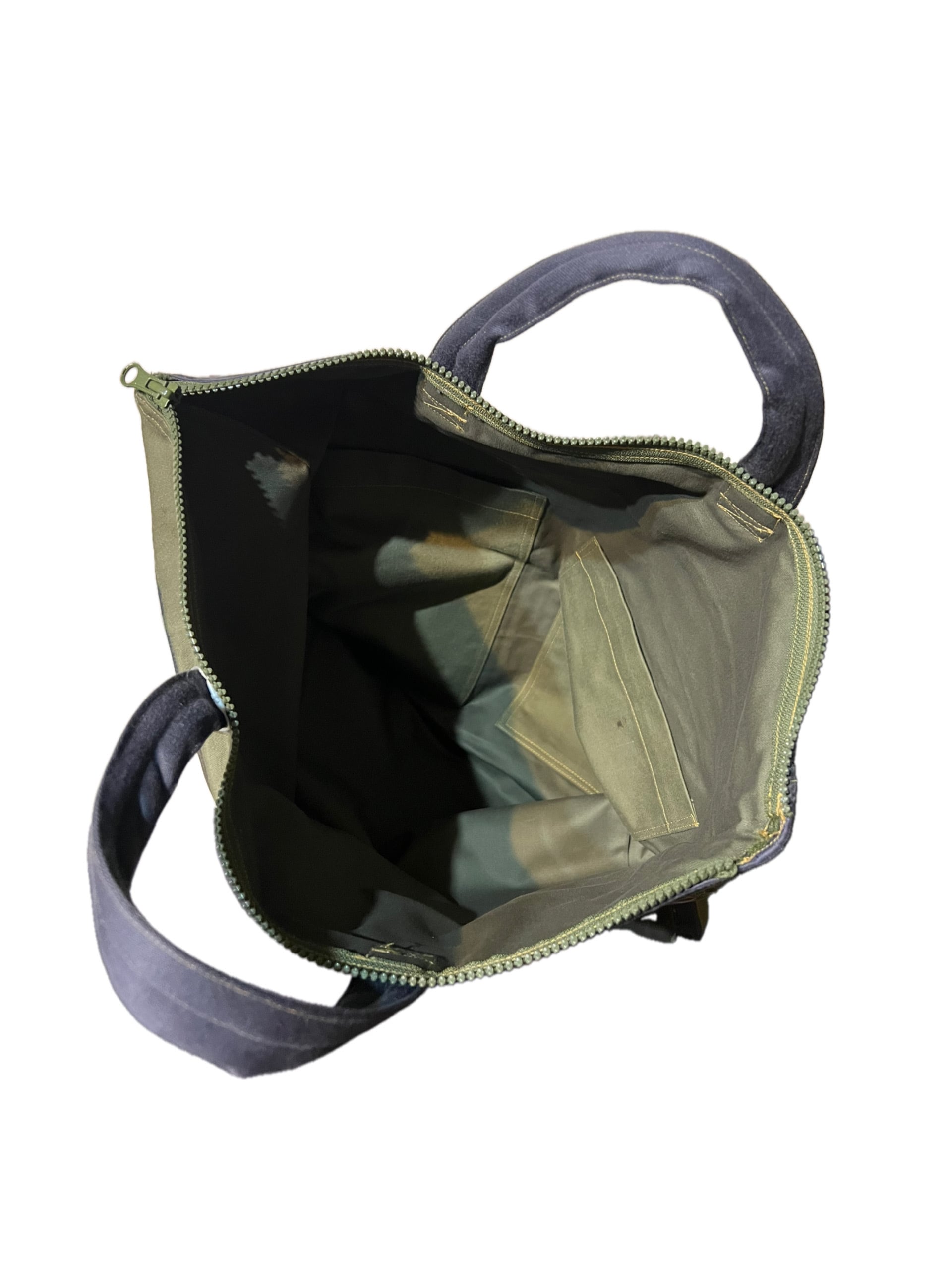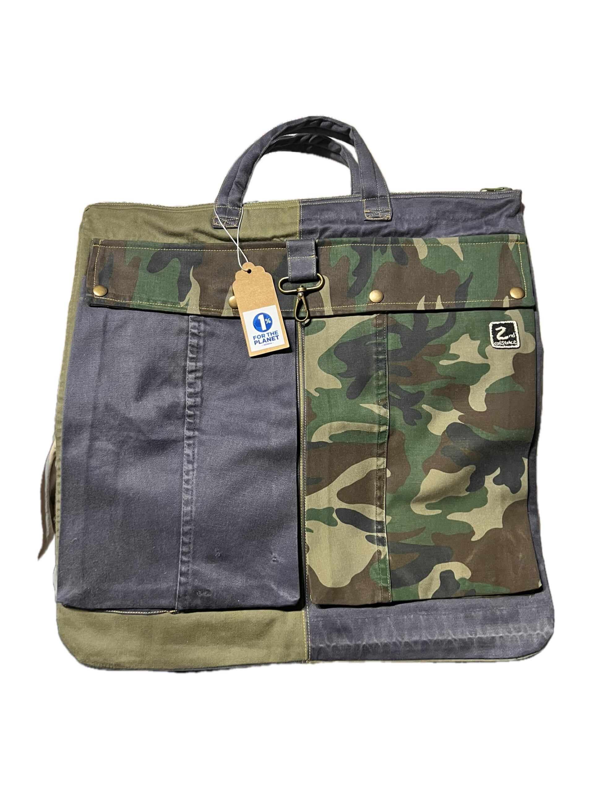 グレー系とカーキ系に迷彩柄でアクセントをつけたリメイクバッグになります。