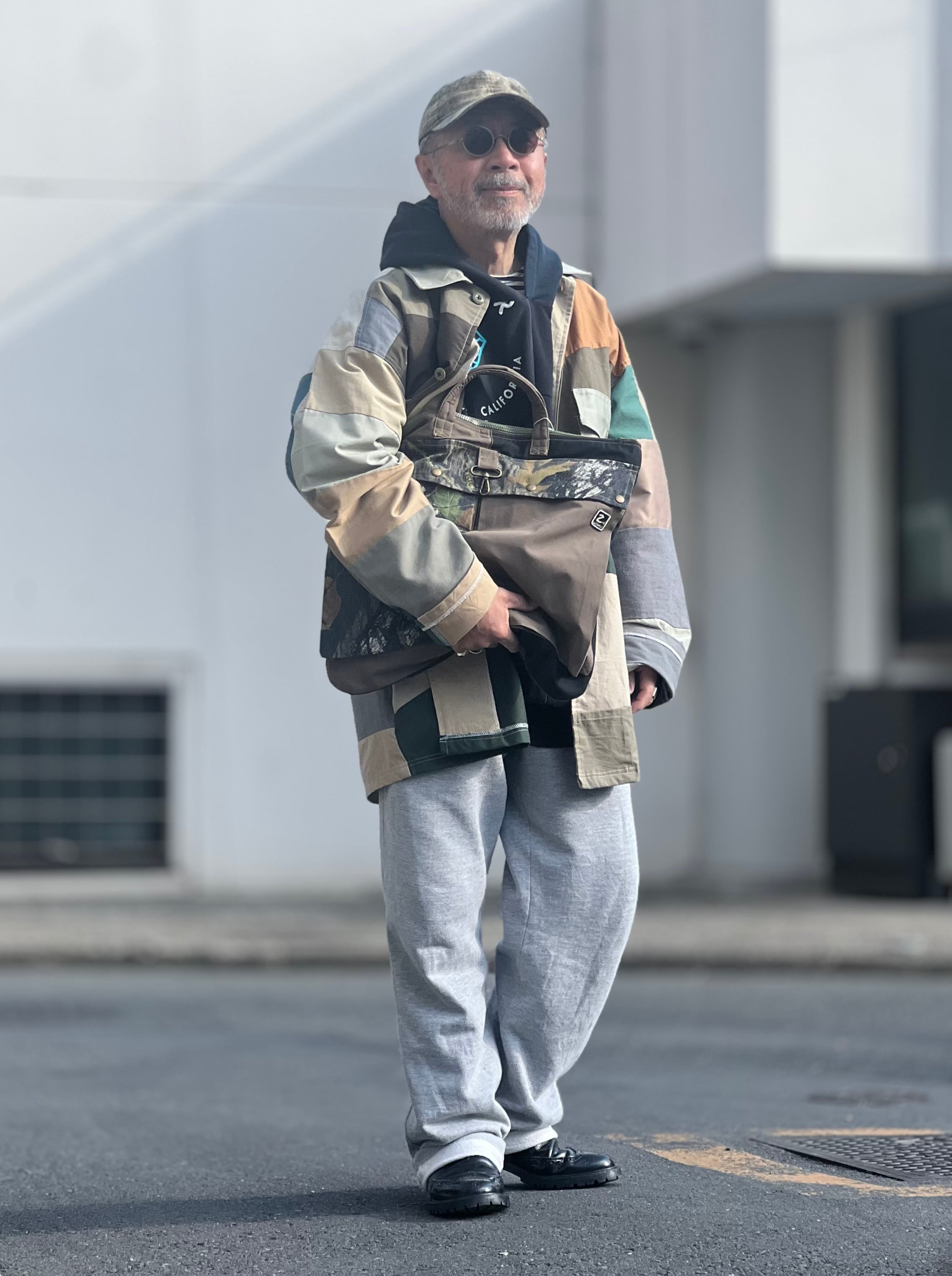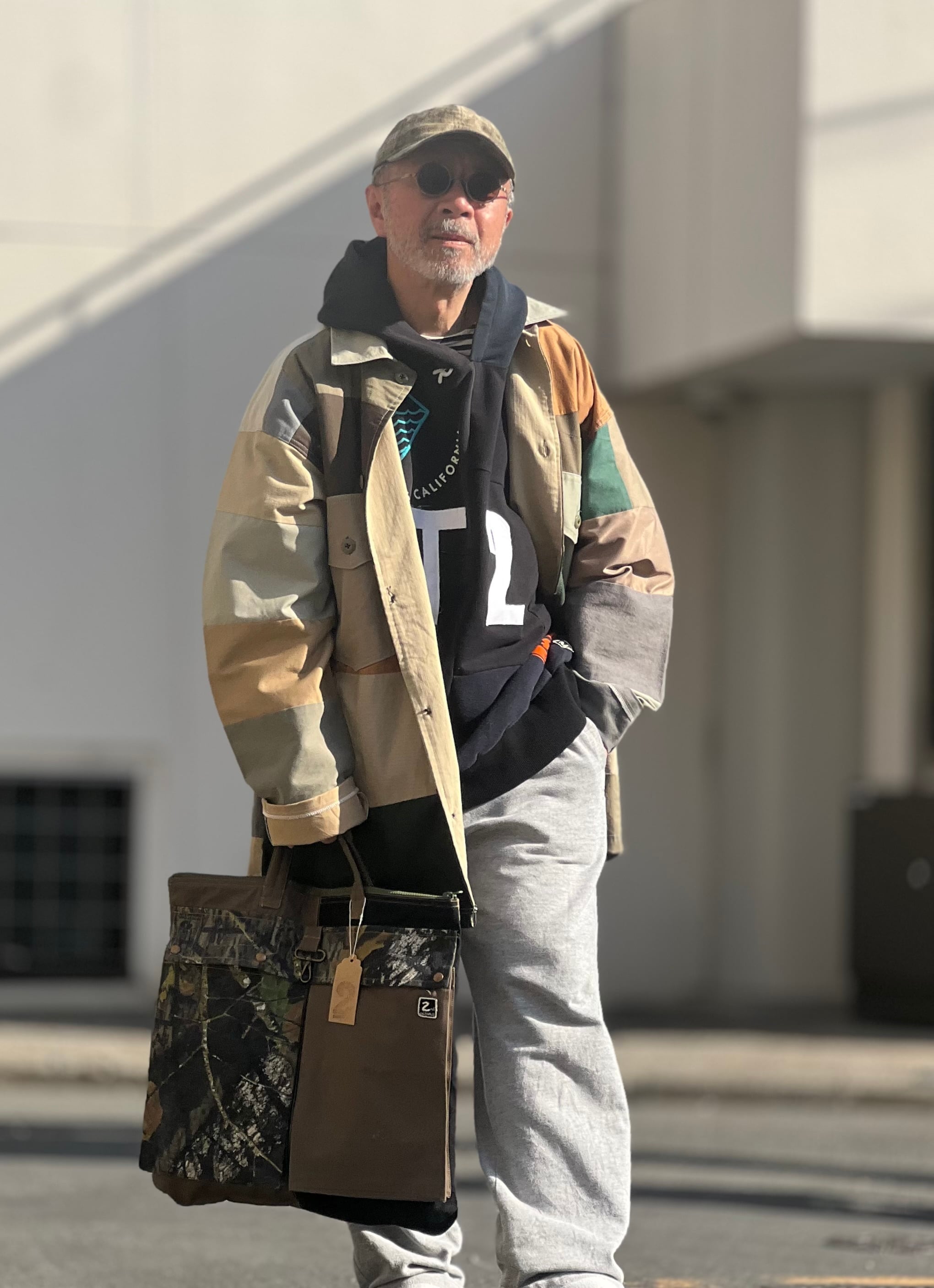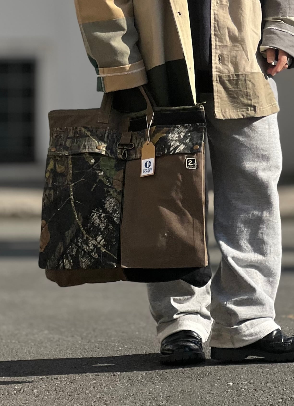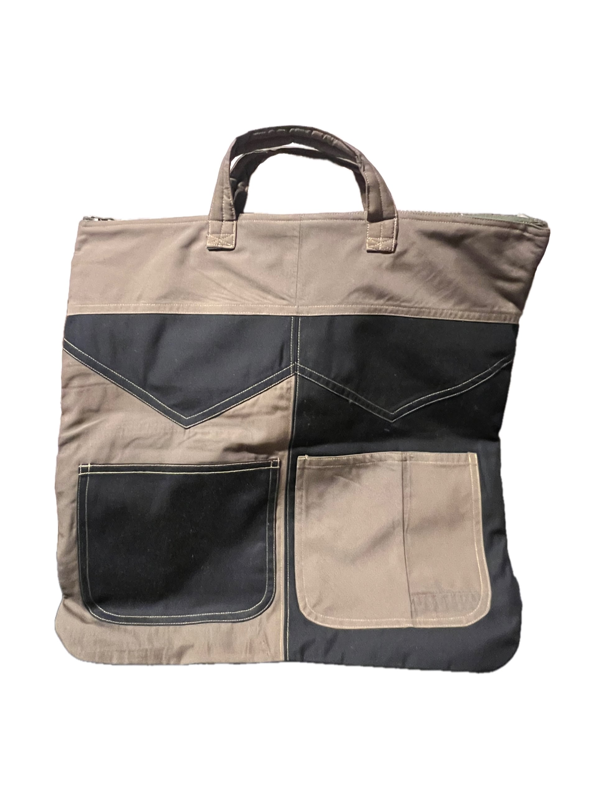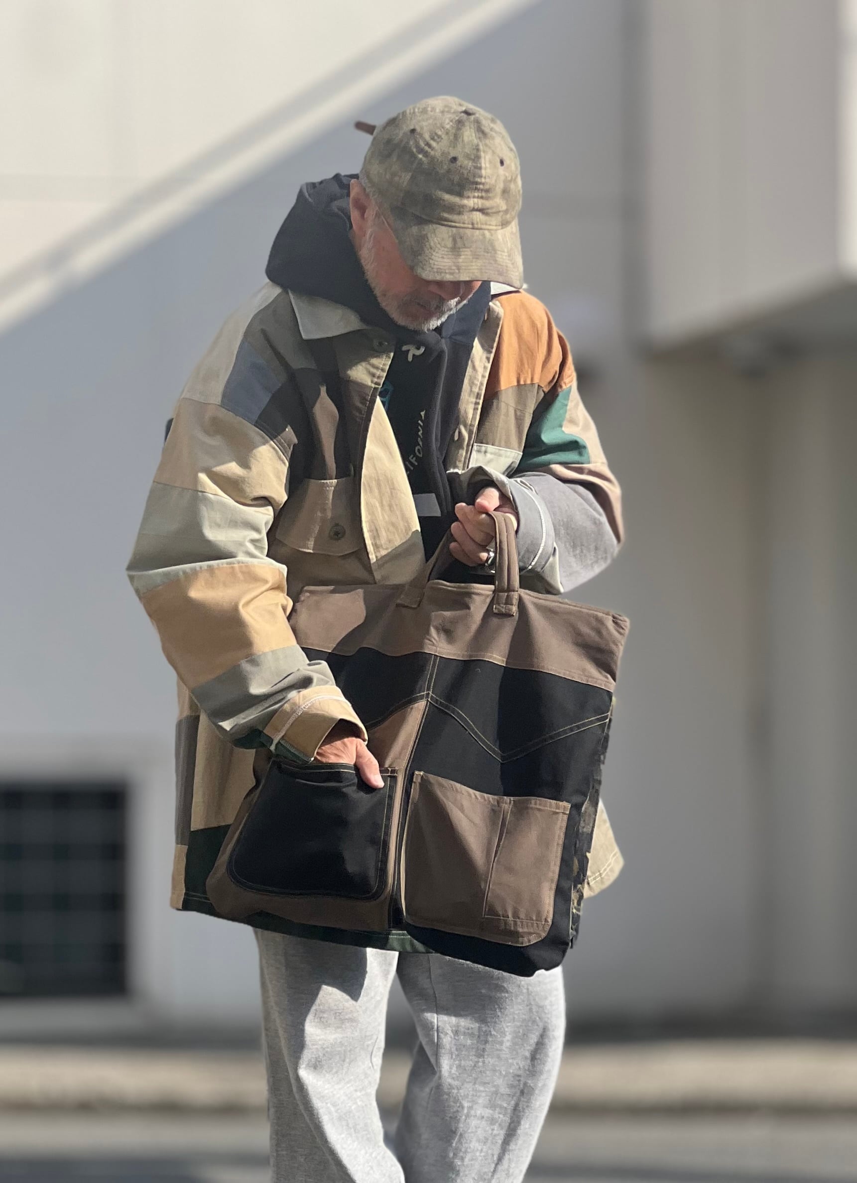 廃棄になるかものパンツや生地を再構築して新しいヘルメットバッグに生まれ変わらせました。唯一無二の1点ものになります。実用性を考えで表側面と内側にポケットを各2つ付けました。とても便利です!黒とブラウン系の生地に柄ものを混ぜています。凄く落ち着いたモード感のある商品に仕上がっています。