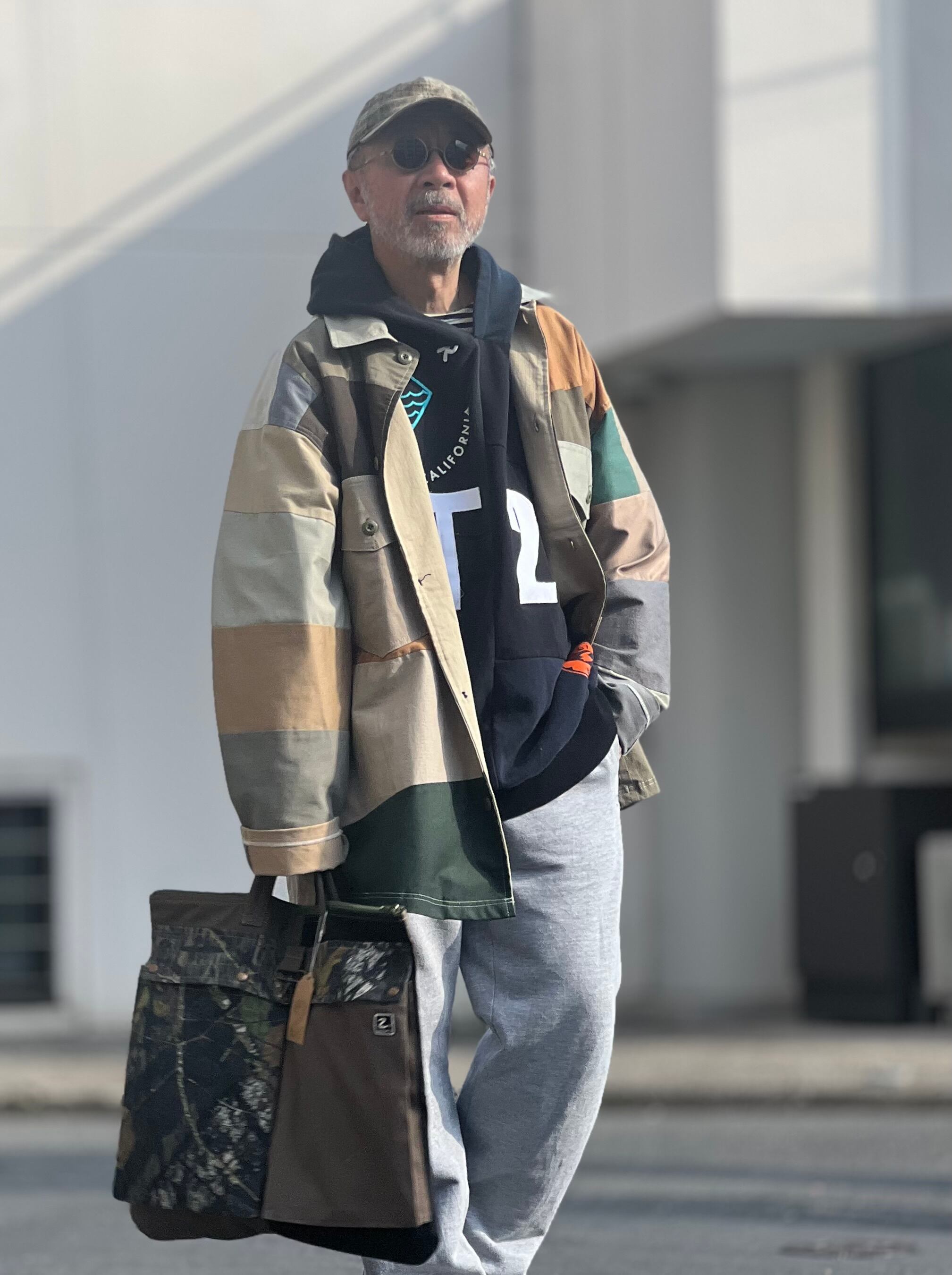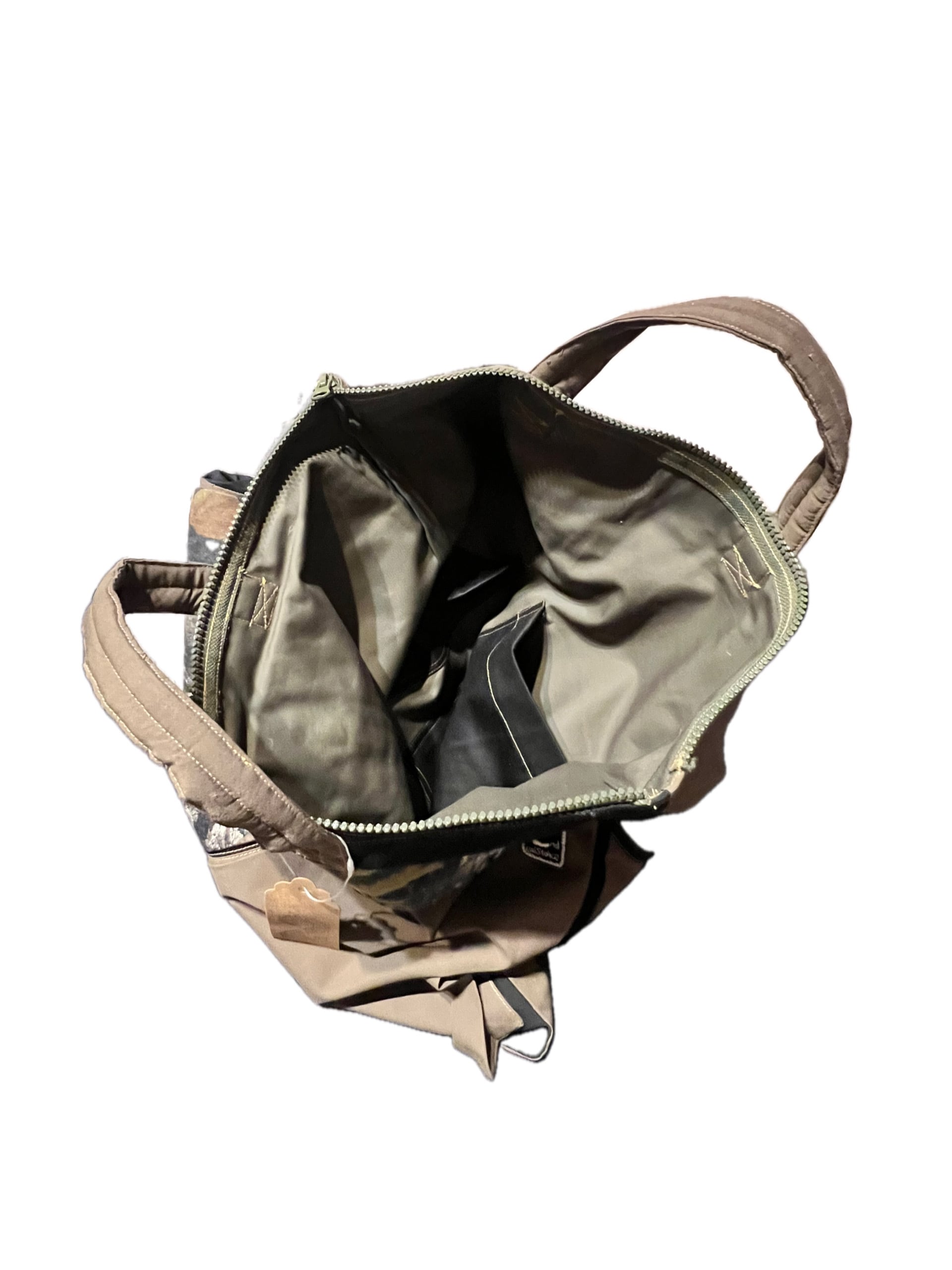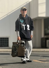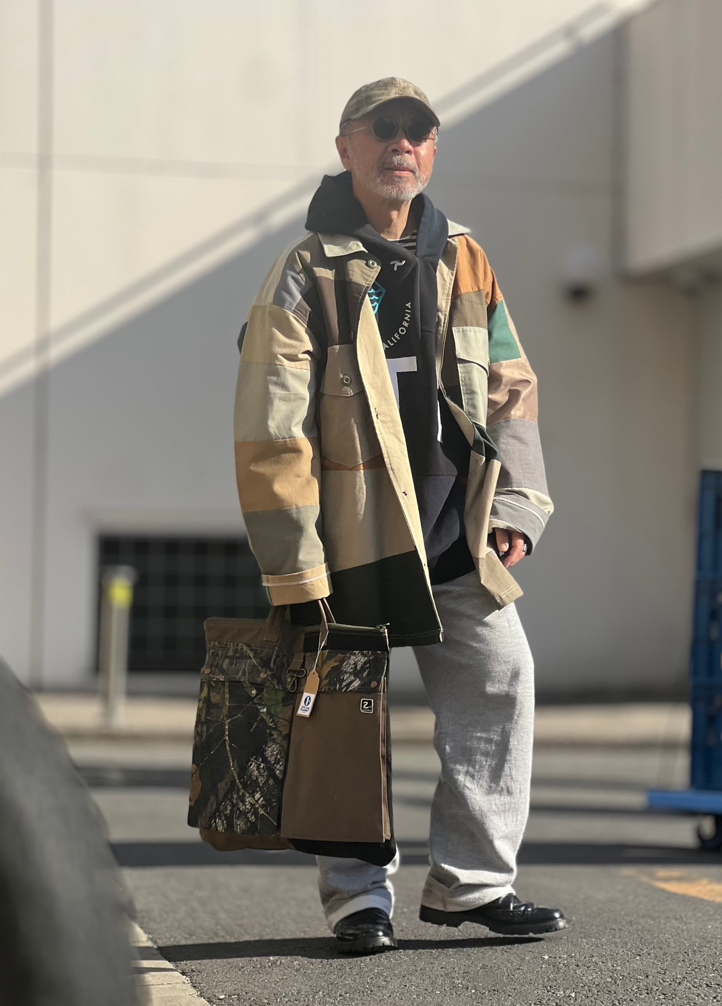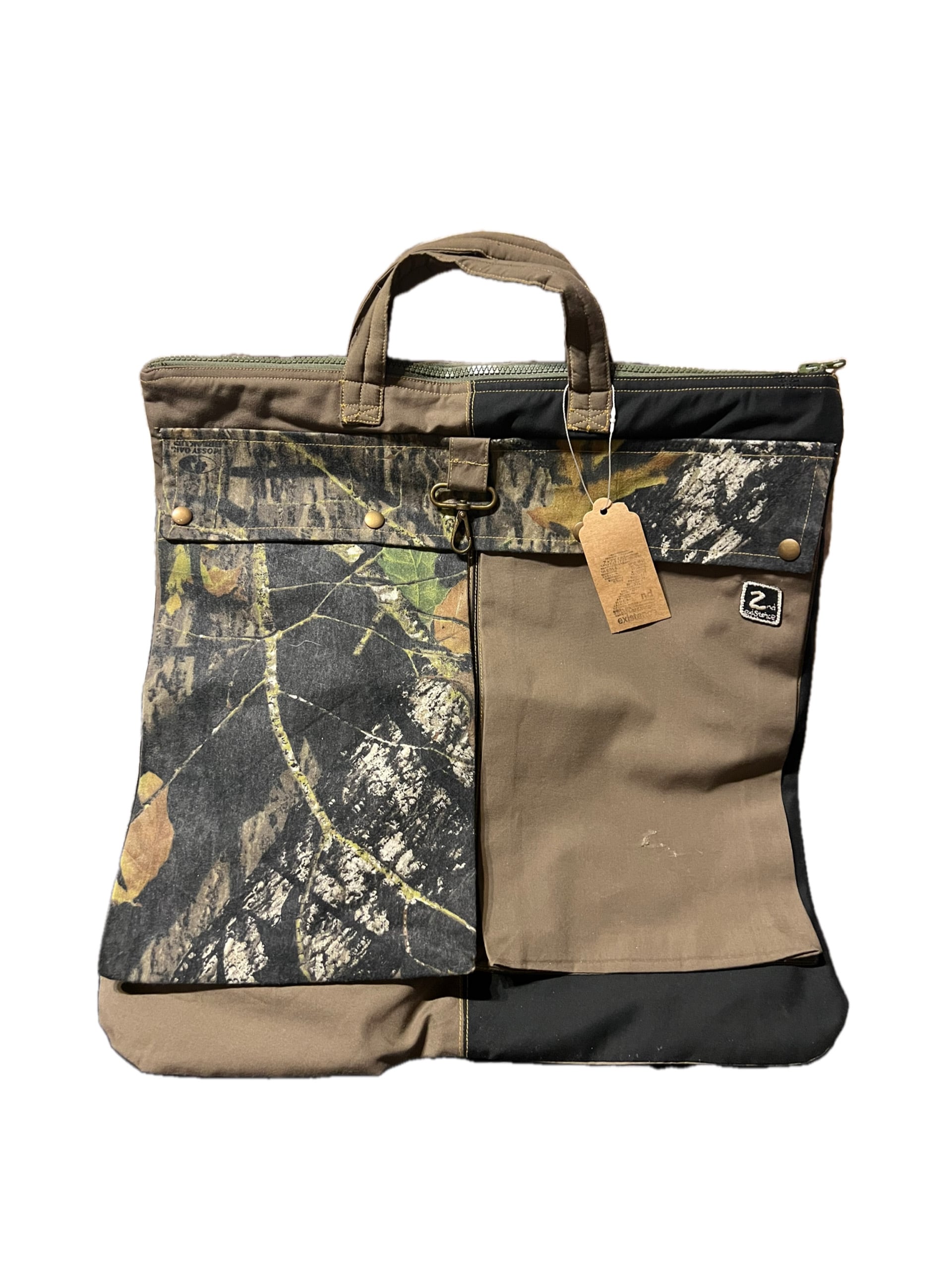 廃棄になるかものパンツや生地を再構築して新しいヘルメットバッグに生まれ変わらせました。唯一無二の1点ものになります。実用性を考えで表側面と内側にポケットを各2つ付けました。とても便利です!黒とブラウン系の生地に柄ものを混ぜています。凄く落ち着いたモード感のある商品に仕上がっています。